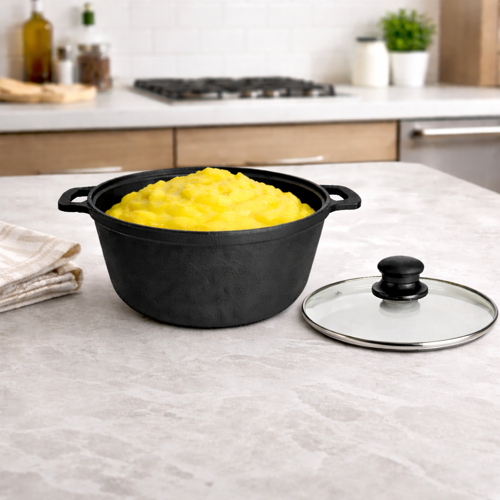 Incalzire graduala si uniforma, fiind un material foarte dens mancarea se gateste tot uniform. Cratiță fontă cu capac sticlă 2 L este ideal pentru plite gaz sau electrice, pirostri, plite traditionale si plitele cu inductie.
