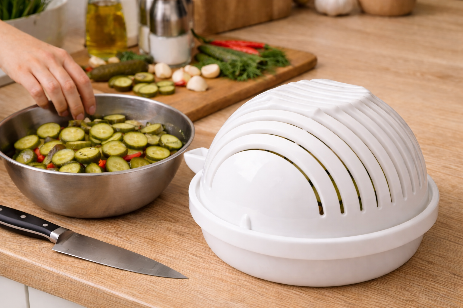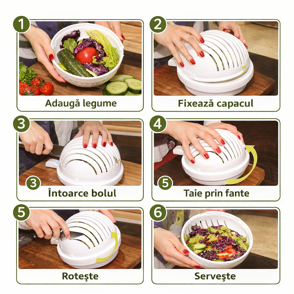 Tocătorul de salată cu bol este soluția practică pentru prepararea rapidă și uniformă a salatelor și legumelor proaspete. Designul inteligent permite tăierea ingredientelor direct în recipient, fără efort și fără riscuri, economisind timp în bucătărie.